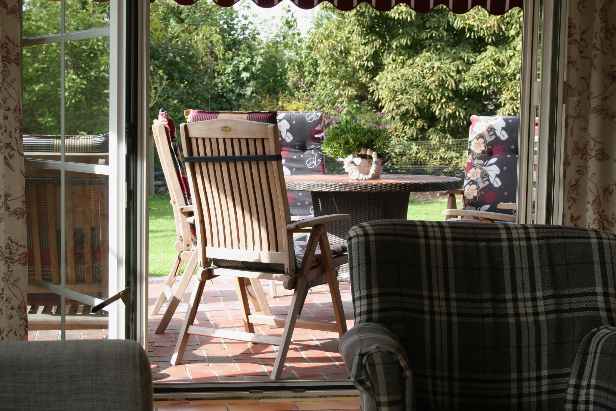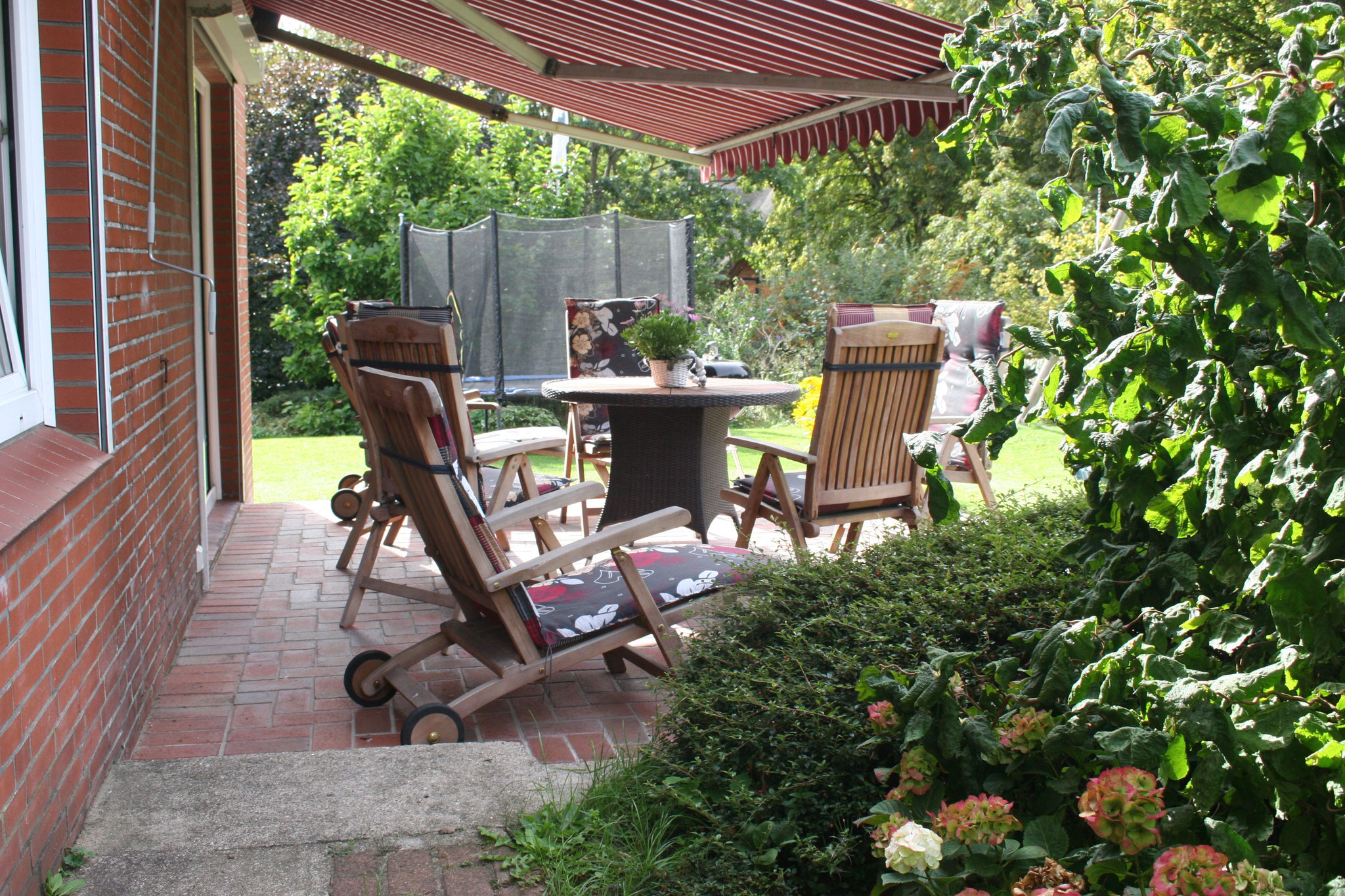Terrasse in Süd-West-Ausrichtung mit Markise, 5 Teak-Hochlehner, 2 Teak-Deckchairs